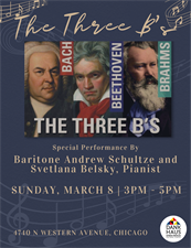 Andrew Schultze & Svetlana Belsky present the 3Bs Concert, featuring selections from J.S. Bach’s Peasant Cantata, Beethoven’s Adelaide, and songs from Brahms’ Opuses 48 & 49. This thoughtfully curated program highlights the expressive depth and musical evolution of three iconic composers, blending lyrical storytelling, romantic emotion, and timeless artistry in an intimate recital experience.